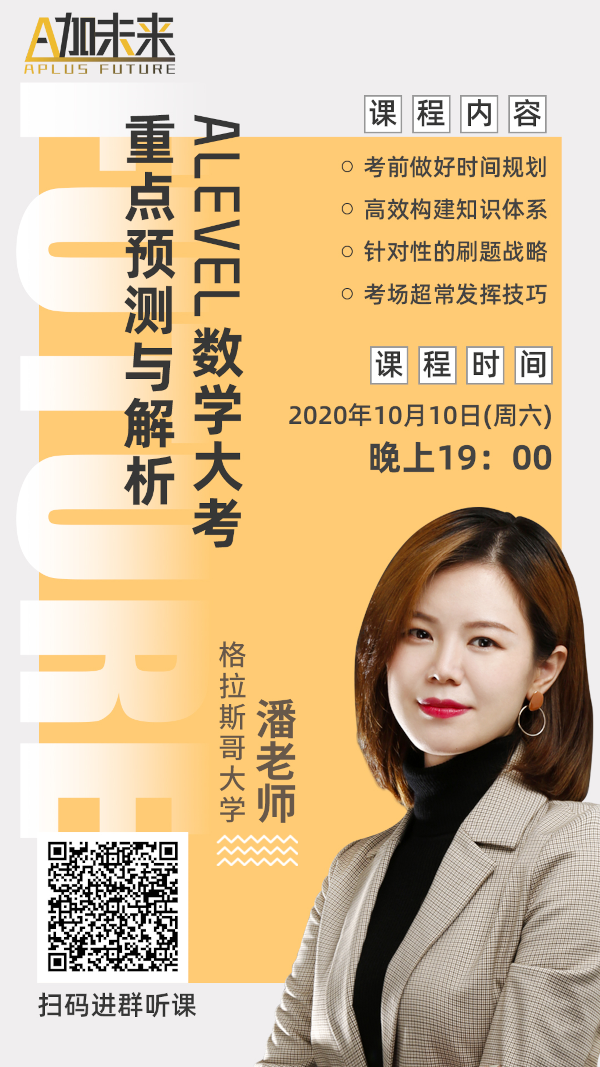 如果說(shuō)你還是有無(wú)法突破的點(diǎn),有無(wú)法捋清的思路,對(duì)復(fù)習(xí)無(wú)從下手,成績(jī)總是無(wú)法獲得突破... ...那就來(lái)A加未來(lái)的公益課堂吧,10月10日A加未來(lái)潘老師手把手交給你考場(chǎng)超長(zhǎng)發(fā)揮技巧!干貨滿滿,真正做到“哪里不會(huì)點(diǎn)那里”!
