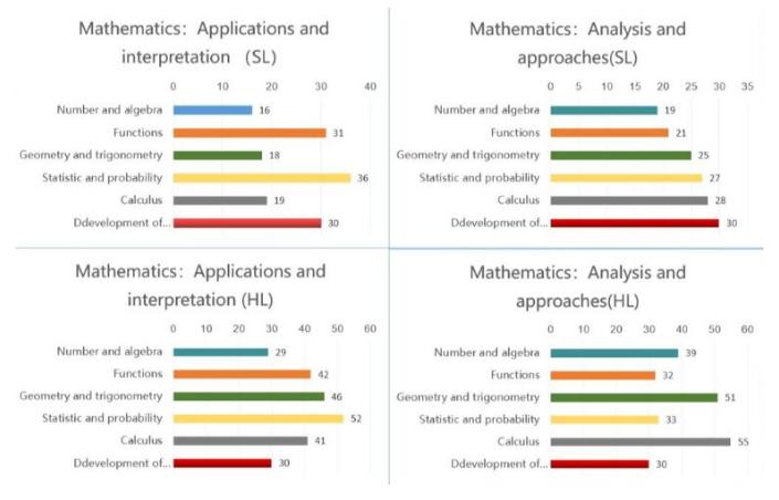 如上圖所示,應(yīng)用數(shù)學(xué)的SL非常重視函數(shù)、統(tǒng)計與概率兩個板塊。而分析數(shù)學(xué)的SL則相對平衡,其中微積分是占比最大的板塊。應(yīng)用數(shù)學(xué)的HL在函數(shù)、統(tǒng)計與概率之余大幅增加了幾何與三角函數(shù)的內(nèi)容,同時微積分相關(guān)內(nèi)容也做了相應(yīng)增加。分析數(shù)學(xué)的HL則一反之前SL的平衡,把三角函數(shù)和微積分提到了最高優(yōu)先級,同時代數(shù)的內(nèi)容也增加了一倍。