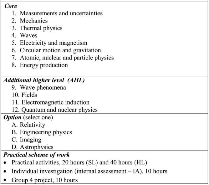 SL物理總學(xué)時(shí)150小時(shí),包含20小時(shí)物理實(shí)驗(yàn)加10小時(shí)跨學(xué)科項(xiàng)目;
