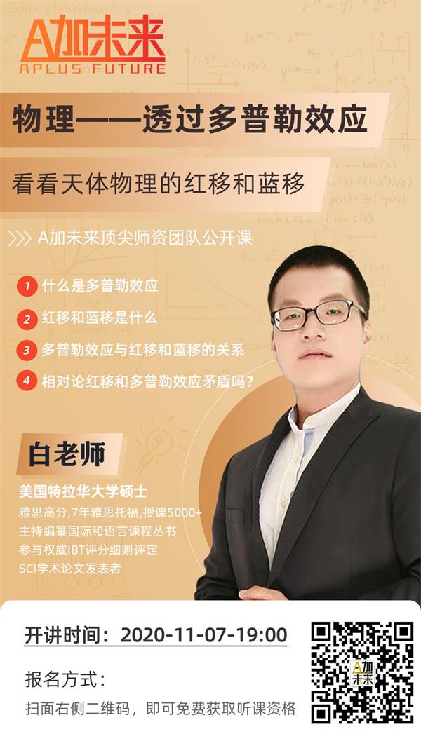 如果你想了解更多關(guān)于“多普勒效應(yīng)”的知識(shí)點(diǎn),本周六就來(lái)A加未來(lái)線上直播課,資深的Alevel物理老師將帶你更深度了解一下多普勒效應(yīng)的“魅力所在”。