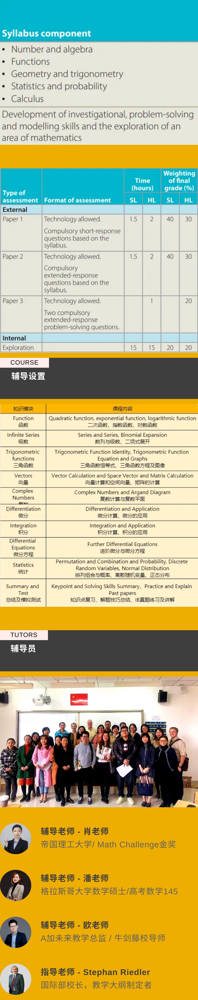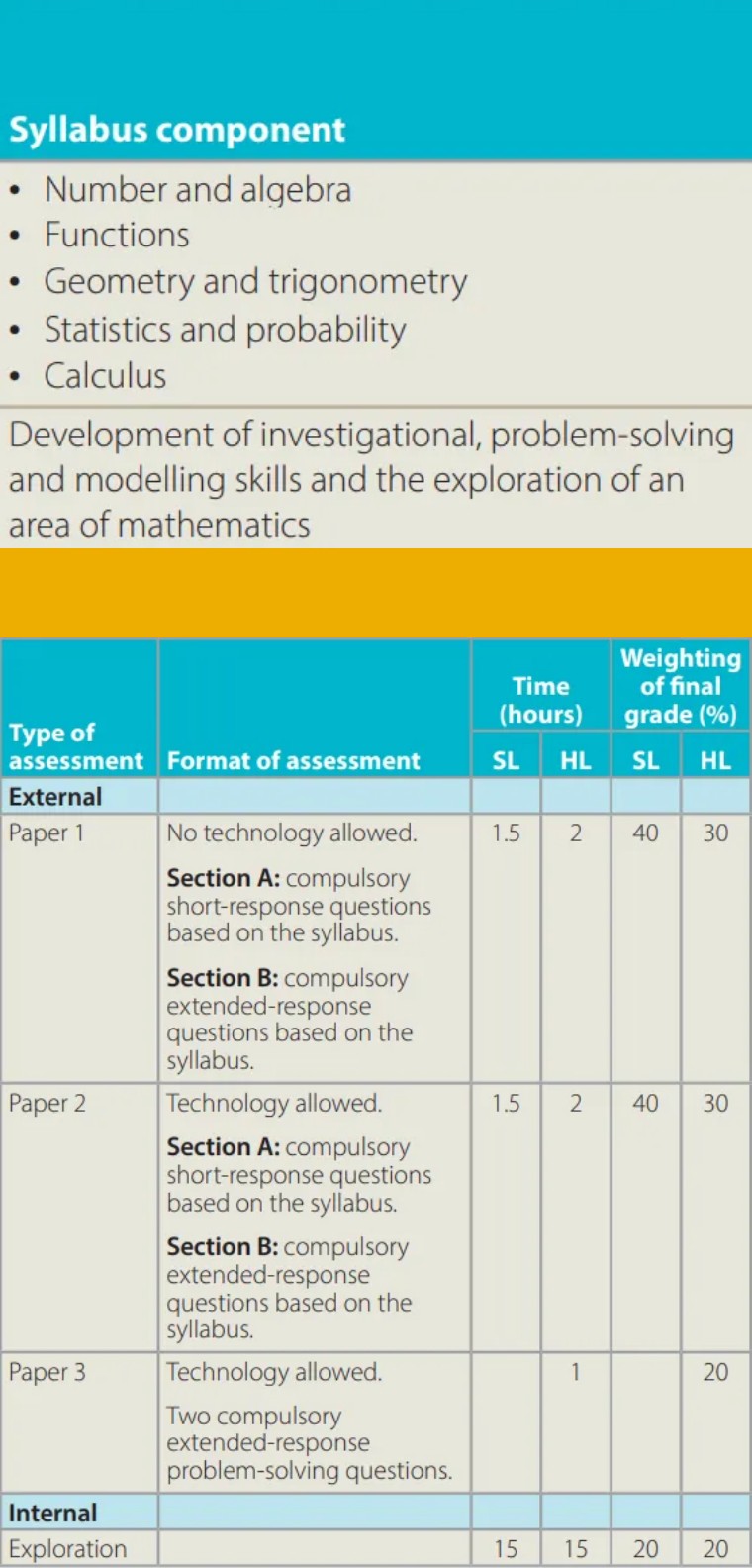 一般學(xué)校都會開設(shè)SL和HL數(shù)學(xué),一些不太擅長數(shù)學(xué)或?qū)韺I(yè)與數(shù)學(xué)關(guān)系不大的學(xué)生會選擇Math SL,而數(shù)學(xué)能力中等偏上的學(xué)生一般會選擇Math HL,最后的考核除了試卷考試(占80%),學(xué)生還需要完成一篇長度為10頁左右的探究性報告(internal assessment,占20%)。
