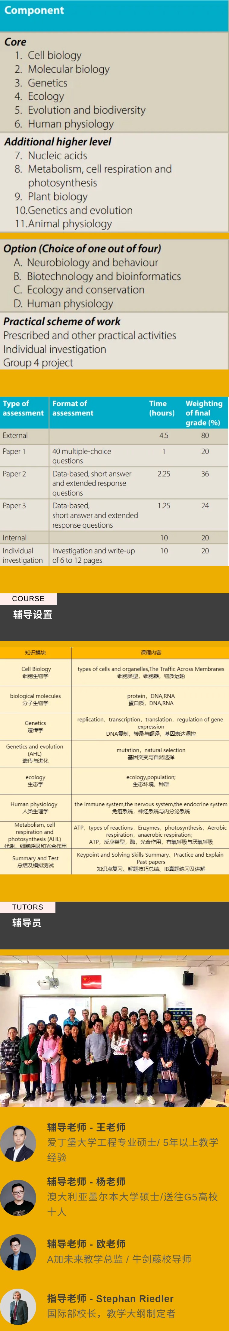 學(xué)習(xí)內(nèi)容:HL的課程內(nèi)容在SL的基礎(chǔ)上還要再學(xué)習(xí)以下更加深入拔高的內(nèi)容——核酸、代謝、細(xì)胞呼吸和光合作用、植物生物學(xué)、遺傳與進(jìn)化、動(dòng)物生理學(xué)。